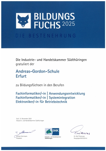 Für die hervorragenden Leistungen in der Abschlussprüfung 2025 wurden Absolventen der AGS mit dem Bildungsfuchs der IHK Südthüringen geehrt.
