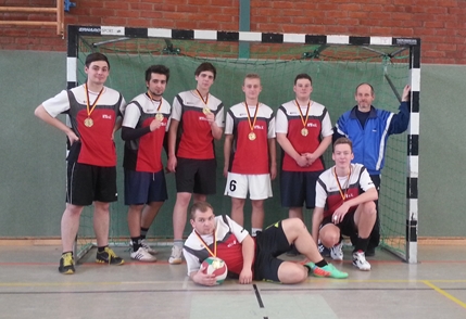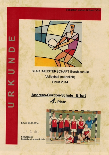 Im Rahmen der Tage des Berufsschulsports fand am Donnerstag, 06.03.2014 ein großes Volleyballturnier statt. Teilgenommen haben Mannschaften der Berufsbildenden Schulen der Stadt Erfurt. Die Mannschaft der AGS (Christopher Beulich, EBT13C / Fabian Dunkel, EBT13C / Nicolas Schneider, FIS11B / Steven Kosteczka, FIS 11B / Lukas Pura, BG11G / Karl Pasold FIS11B und Dominic Zerbst, FIS11B unter der sportlichen Leitung von Herrn Neunemann (Lehrer) gingen als Sieger hervor und konnten Gold mit nach Hause nehmen. Wir gratulieren unseren Sportlern ganz herzlich zu diesem Erfolg.
