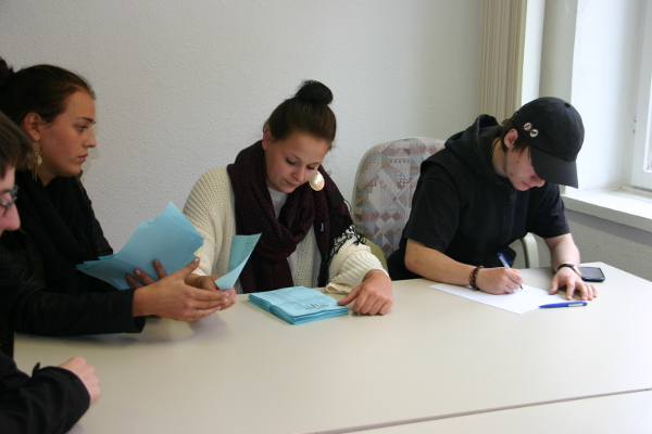 Die Wahllokale wurden von insgesamt 15 Schülerinnen und Schülern aus beiden Schulteilen betreut. Daneben standen Frau Göpel, Frau Lucht-Renner und Herr Mayer als Initiatoren und Organisatoren bereit, um die vielen Fragen rund um die Wahl zu beantworten.