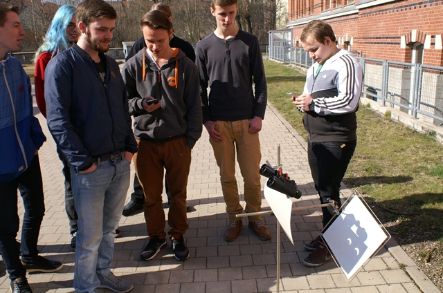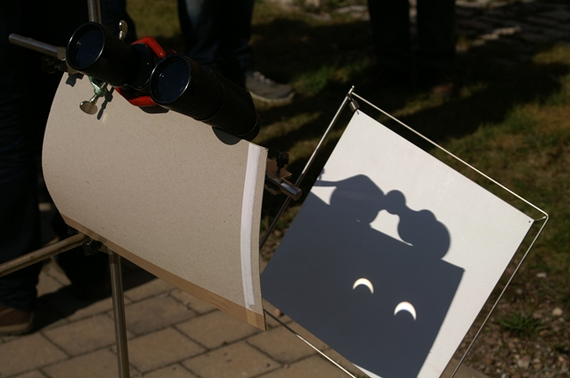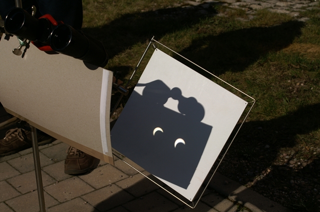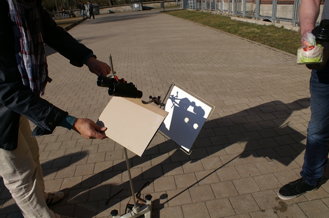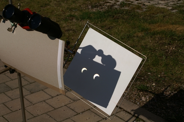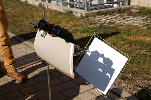 Für unsere Schüler war die partielle Sonnenfinsternis am Freitag, dem 20. März 2015 natürlich auch ein besonderes Highlight. Herr Binder (Mathe-/Physiklehrer) hatte eigens dazu eine Betrachtungsstation bestehend aus einem Fernglas und einer Projektionsfläche auf dem Schulhof aufgebaut. So konnten zwischenzeitlich weit über hundert Schüler dieses besondere Naturspektakel ohne Gefährdung verfolgen. Für den Standort Erfurt war die partielle Sonnenfinsternis mit 74% zu beobachten.