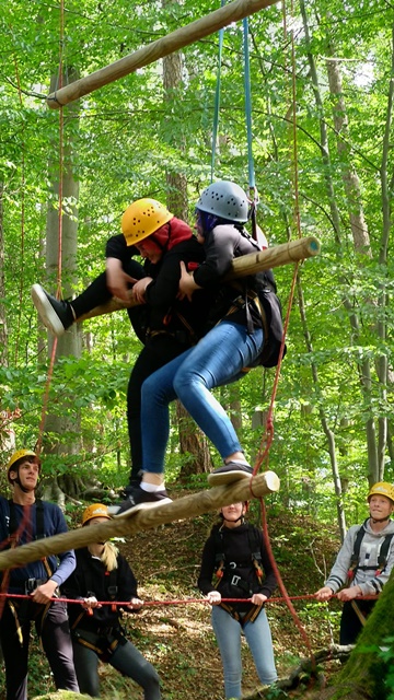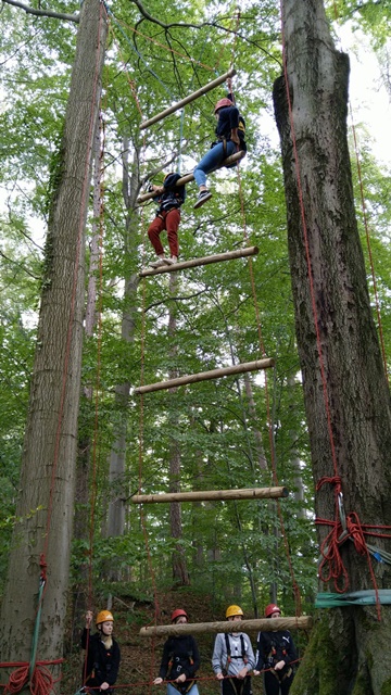 Auch am Donnerstag erwarteten uns die „Schattenspringer“ - heute mit einer Klettertour. Die Herausforderung beim Klettern bestand darin, zu zweit eine Riesenstrickleiter zu erklimmen. Durch diese Aufgabe gewannen wir viel Vertrauen in unsere Mitschüler, da wir uns gegenseitig gesichert haben. Nach mehrfachem Erklimmen der Leiter waren wir mit unseren Kräften am Ende und genossen den letzten Abend mit unseren neu gewonnenen Freunden.