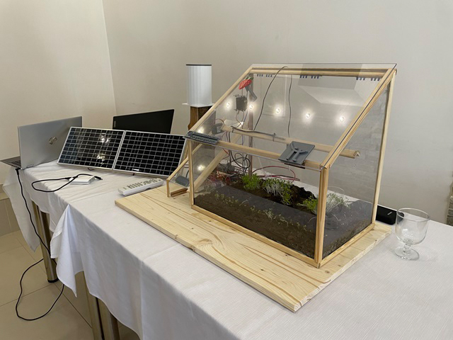 Während des Aufenthaltes wurde gemeinsam mit der Partnerschule ein Projekt durchgeführt. Planen, Konstruieren, Bauen, Löten, Programmieren, … standen auf der Tagesordnung. Ziel war ein Modell eines vollautomatisierten Gewächshauses. Ist die Temperatur zu hoch, öffnet sich das Dach. Ist es im Gewächshaus zu trocken, wird automatisch bewässert und ist es zu dunkel dann wird eine Beleuchtung aktiviert. Zur Stromerzeugung wurden Solarpanels verbaut.