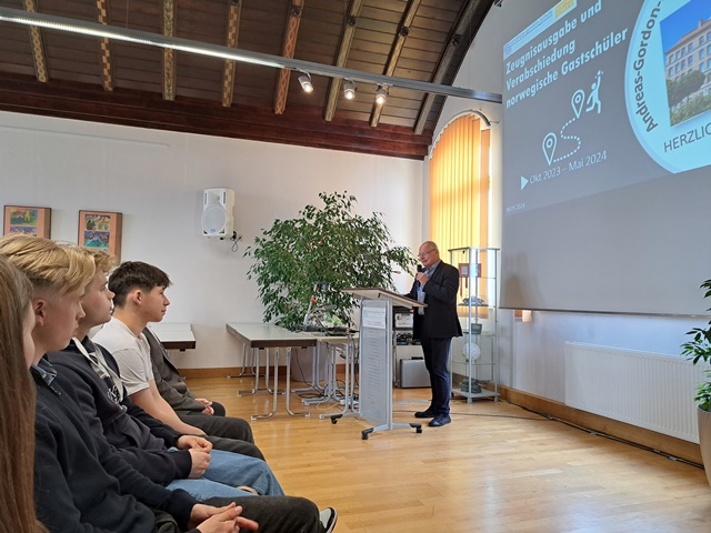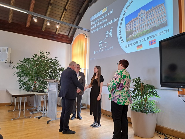Durch die Bürgermeisterin, Frau Hofmann-Domke, den Schulleiter der Partnereinrichtung, Oddvar Skråmestø, und den Schulleiter der Andreas-Gordon-Schule, Karsten Pohlemann, wurde in den Grußworten die besondere Leistung dieser Schüler gewürdigt. Mit der Übergabe des Zeugnisses endete an diesem Tag offiziell der Aufenthalt an der AGS.