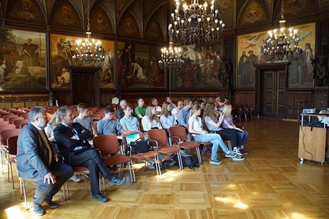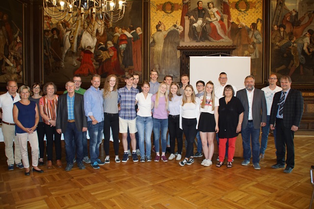 Am Dienstag, 08.05.2018 wurden die diesjährigen Gastschüler offiziell im Festsaal des Rathauses Erfurt verabschiedet. Neben Bürgermeisterin, Frau Thierbach, Amtsleiter im Amt für Bildung, Herr Dr. Ungewiß, waren die maßgeblich am Austausch beteiligten Personen anmesend. Der Dank an die beteiligten Praktikumsunternehmen wurde stellvertretend an Herrn Hertzsch von der Firma Eltrok GmbH ausgesprochen. Das der Schulleiter der Partnerschule, Herr Oddvar Skråmestø, seine Festrede in Deutsch gehalten hat, war für alle Beteiligten sehr beeindruckend. Auch der spontane musikalisch, virtuose Beitrag eines Gastschülers am Flügel und seine hervorragenden Deutschkenntnisse haben das Publikum sehr überrrascht.