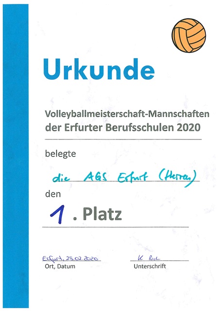Das Volleyballteam (Herren) der AGS siegte am Dienstag, 25.02.2020 bei den Volleyballmeisterschaften der Erfurter Berufsbildenden Schulen 2020.