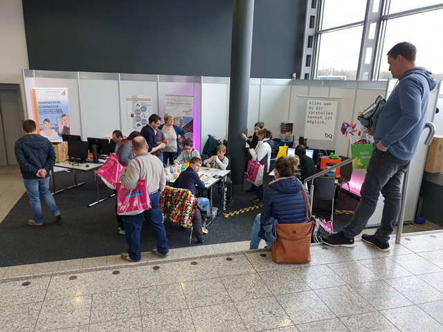 Im Mittelpunkt des Tages der offenen Tür standen aber auch die vielen Beratungsgespräche zu den angebotenen Vollzeitschulformen und Bildungsgängen an der AGS. Die interessierten Schülerinnen und Schüler und ihre Eltern konnten sich zum Beruflichen Gymnasium mit den Schwerpunkten Elektrotechnik, Datenverarbeitungstechnik und Gesundheit und Soziales informieren. Für das sogenannte Handwerkergymnasium im Schwerpunkt Elektrotechnik gab es zusätzliche Beratungen. Die Gäste konnten sich ebenfalls zur Fachoberschule Technik (Elektro-/Infomationstechnik), der Berufsfachschule Technik (Metall/Elektro) und zur Fachschulausbildung informieren. Selbstverständlich gaben die Lehrerinnen und Lehrer auch Auskünfte über die berufliche Ausbildung im Bereich der Elektro- und IT-Ausbildung. Die Infostände vom BIZ der Agentur für Arbeit, der Fachhochschulen Erfurt und Schmalkalden, der Ernst-Abbe-Hochschule Jena, der Uni Erfurt, der TU Ilmenau, der IHK und HWK Erfurt und mehrerer Ausbildungsunternehmen der Region (Gebäudereiniger, X-Fab, JVA) ergänzten das Beratungsangebot sehr umfangreich.