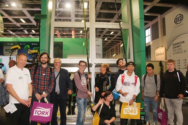 Schüler der Klasse GR17 informieren sich während des Messebesuchs über Innovationen im Bereich der Glasreinigung