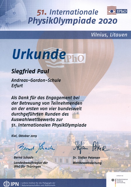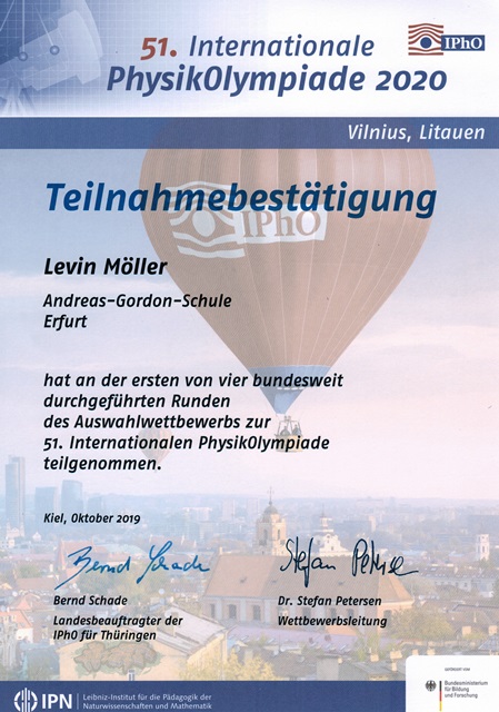 Zur 1. Runde im Auswahlwettbewerb zur 51. Internationalen PhysikOlympiade 2020 hatten sich 1.080 physikinteressierte Schülerinnen und Schüler angemeldet. Davon haben gut 800 Schülerinnen und Schüler entsprechende Bearbeitungen mit kniffligen Aufgaben zum Thema Physik eingereicht. Von der Andreas-Gordon-Schule hatte sich Herr Levin Möller (BG18DVE) an dieser 1. Runde beteiligt. Unterstützt und betreut wurde Herr Möller durch Herrn Paul (Lehrer). Für dieses Engagement durfte Herrn Möller und Herrn Paul eine Urkunde durch die Schulleitung überreicht werden. Herrn Möller ist leider nur knapp der Sprung in die 2. Auswahlrunde nicht gelungen. Umso mehr werden wir das Ziel verfolgen, bei künftigen Auswahlwettbewerben noch erfolgreicher anzutreten.